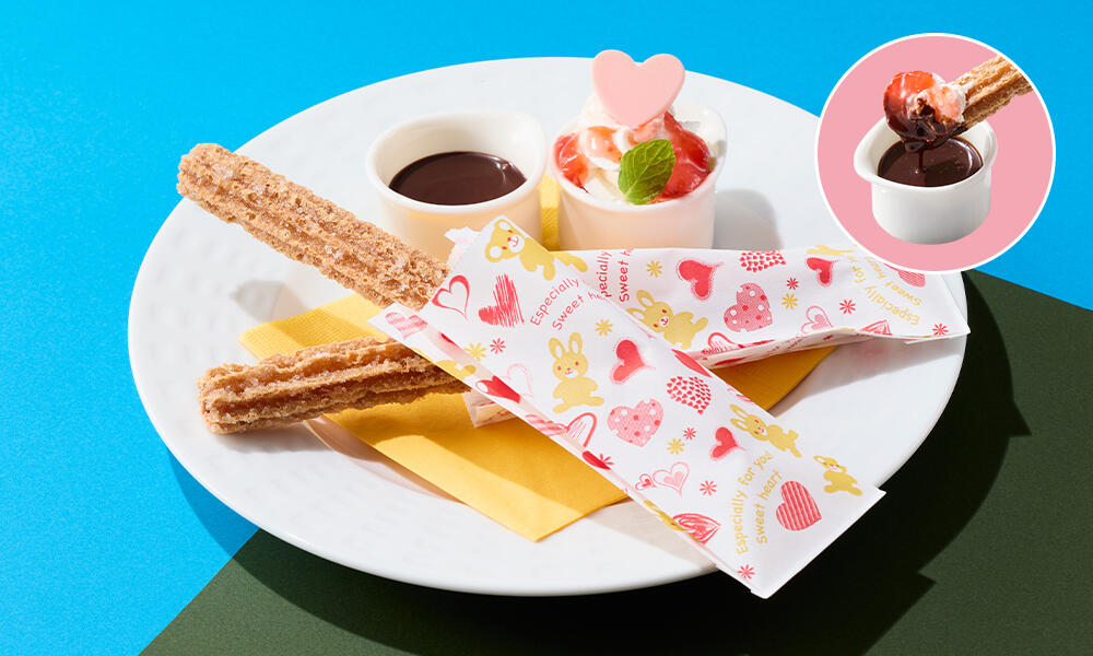チュロスをチョコソースやストロベリーソースをかけたホイップにディップしてお楽しみください。