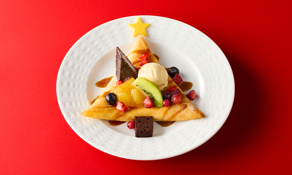ホイップをもちもちのクレープで包み、星チョコやガトーショコラ、キウイ、バニラアイス、りんごのコンポート、フローズンミックスベリーをまるでクリスマスツリーの様に飾り付けました。