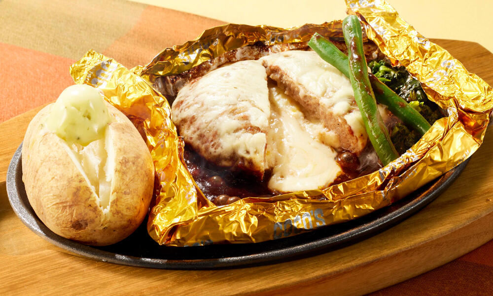 ステッペン・ホワイトチェダー・レッドチェダー・ブルーチーズ・モッツァレラ・パルメザンの6種チーズとココス自慢の本格デミグラスソースを使用した包み焼きハンバーグ。