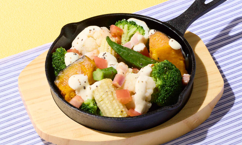 かぼちゃやブロッコリーがゴロゴロ!5種類の熱々温野菜にクリーミーなシーザーソースをジュワッとかけました!