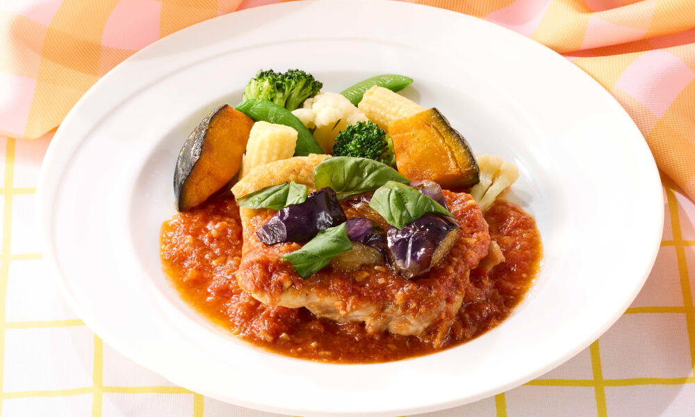 玉ねぎの旨みとトマトの酸味や甘みが絶妙なトマトソースが、チキンステーキやとろっとした食感の揚げなす、温野菜とマッチします。