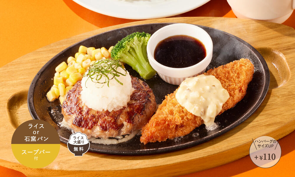 さっぱりおろしをトッピングしたココス自慢のハンバーグと、サクサクな白身魚フライを熱々鉄板にのせて提供します。