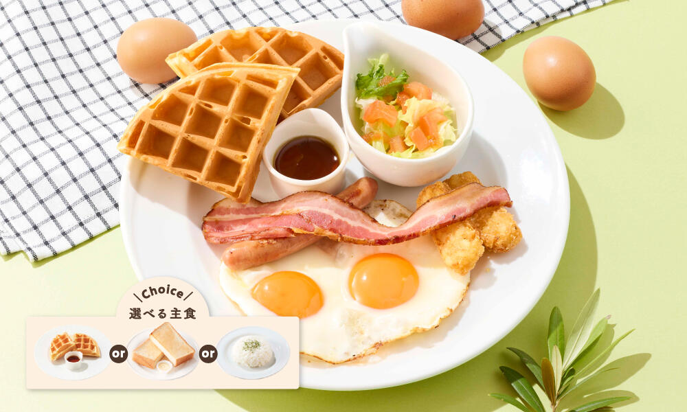 選べる主食は【店内焼き上げのサクふわのワッフル】【トースト】【ライス(大盛り無料)】からお選びください。