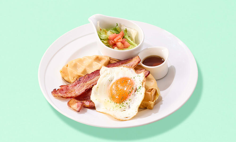店内焼き上げのサクふわのワッフルにカリカリのベーコンとこだわりの卵「茜美人」を使用した目玉焼きをトッピングしました。